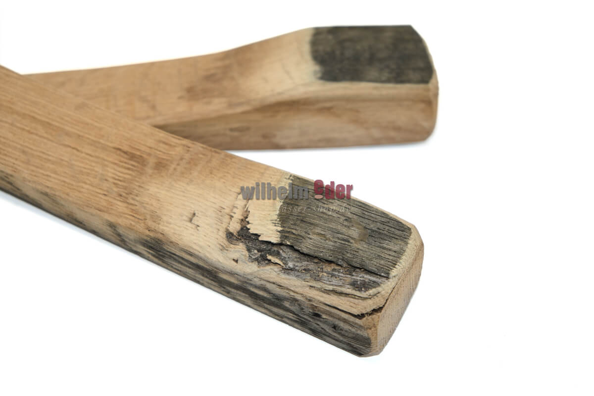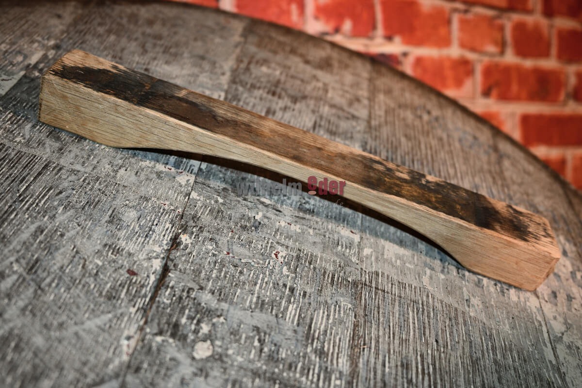 Wooden handle for the lid of a rain barrel, made from a mature Single-Malt Whisky stave.
